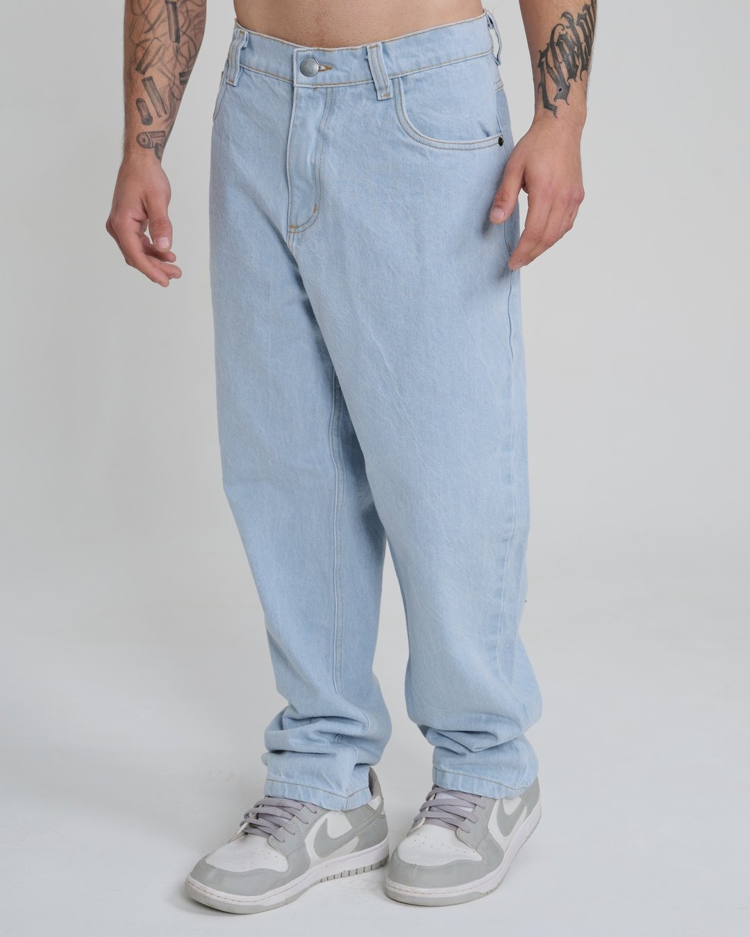 O jeans 100% algodão entrega um toque encorpado, ideal pra quem busca aquele drip pesado, urbano e atemporal. É o tipo de calça que vai bem com tênis de sola robusta, coturnos ou até um par de Dunk Low, dependendo da vibe do dia.