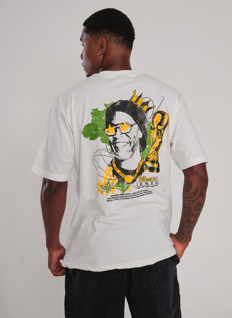 A modelagem é ampla, alongada e com mangas mais largas, entregando aquele visual solto que domina o streetwear global. Ao mesmo tempo, o corte foi pensado estrategicamente para manter estrutura e presença. Não é camiseta larga jogada. É construção de imagem.