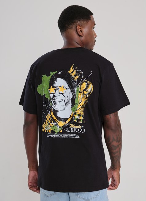 A base preta cria o contraste perfeito para uma estampa impactante que homenageia um dos maiores ícones da bola: Ronaldinho, símbolo de ousadia, criatividade e alegria dentro e fora dos gramados. A arte traz referências diretas à Copa do Mundo, com elementos que remetem ao troféu, às estrelas e à identidade brasileira. Resultado? Uma peça que carrega vitória no peito e nas costas.